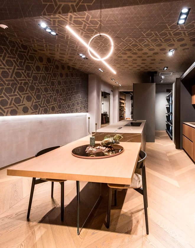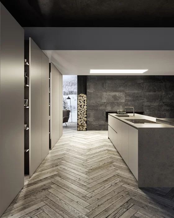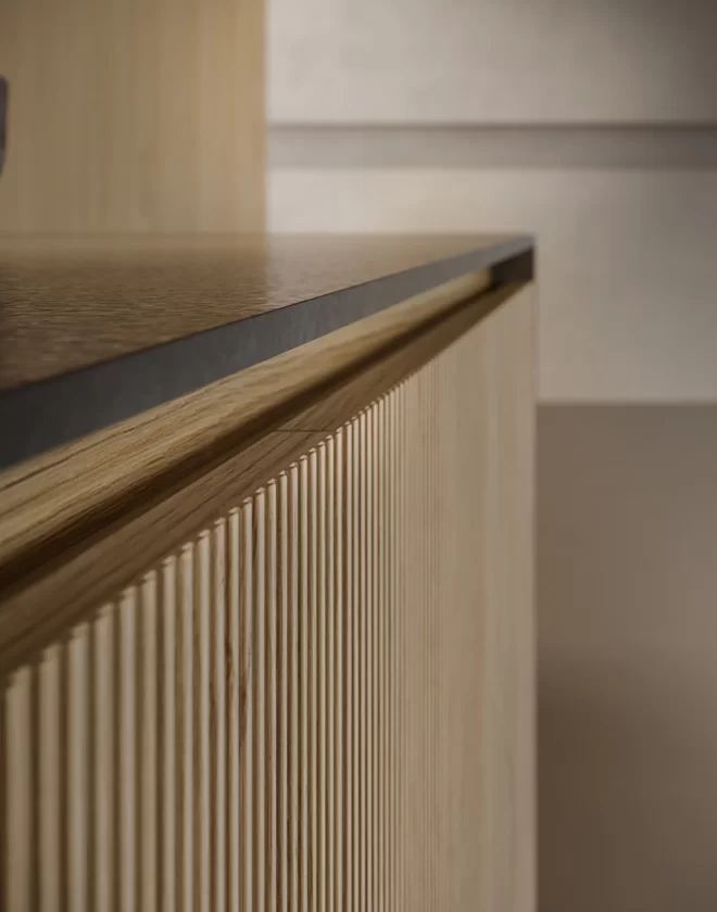 The Bridge accessories and containers, strategically positioned above the worktop and adjacent breakfast table in Terra Oak, serve as both functional elements and aesthetic accents within the Arkè Kitchen. Their thoughtful placement not only enhances usability but also creates a pleasing visual contrast against the kitchen’s backdrop. Made with versatility in mind, these modules offer customized features and are available in a wide range of finishes, allowing them to integrate seamlessly with the evolving design scheme of the surrounding space. As such, they not only add practicality to daily kitchen routines but also contribute to the overall character and sophistication of the environment, ensuring a harmonious balance between form and function.